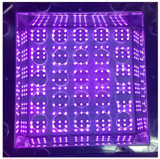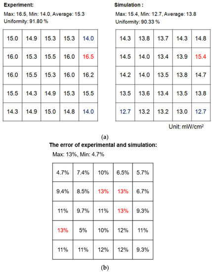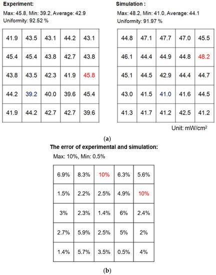 The simulation results are shown in Figure 27 and compared with the experimental results in Figure 28. The strongest and weakest light intensities are the same positions, the experimental uniformity is 91.8%, and the simulation uniformity is 90.33%. The maximum error value of experimental and simulation is about 13%. Figure 29 is the experimental model of LED power adjustment type 2 in the actual process.