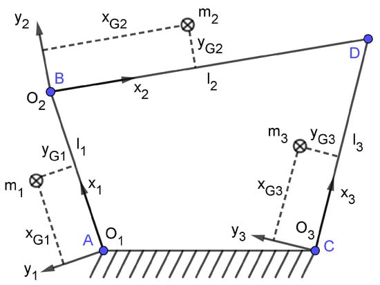Table 1 presents the parameters of a four-bar linkage (Figure 2). The material used for the links is steel with a density of 7800 kg/m. The counterweights are made from brass with a density () of 8500 kg/m.