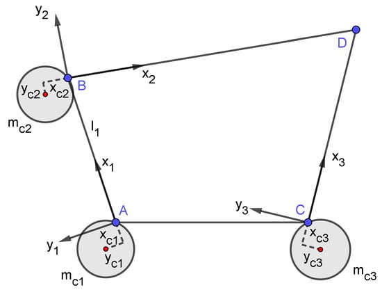 Figure 1 shows a four-bar linkage consisting of four rigid bodies located in the same plane. A motor is located at point A, so the crank AB rotates with velocity . and represent the length of each link. By using Fully Cartesian coordinates [9] to represent the system, it is easy to obtain the equations of the ShF and ShM. This method has been previously used in [22,25,26].