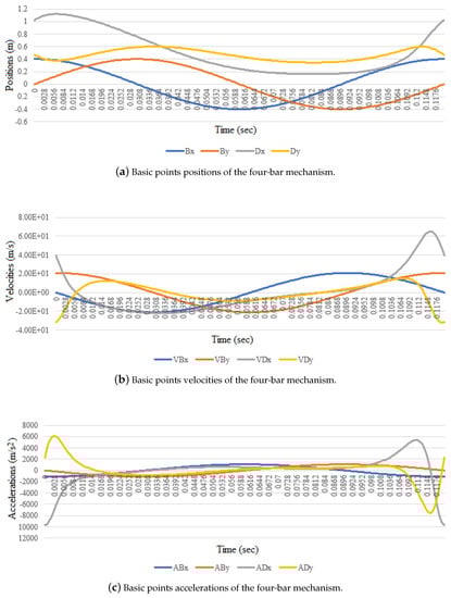 Figure 3 shows the results of the direct kinematics using the mechanism parameters presented in Table 1. It is important to notice that Figure 3a only presents the positions of points B and D (points A and C are fixed). The same occurs with Figure 3b,c where only the velocities and the accelerations of points B and D are presented (this parameters are always zero for points A and C).
