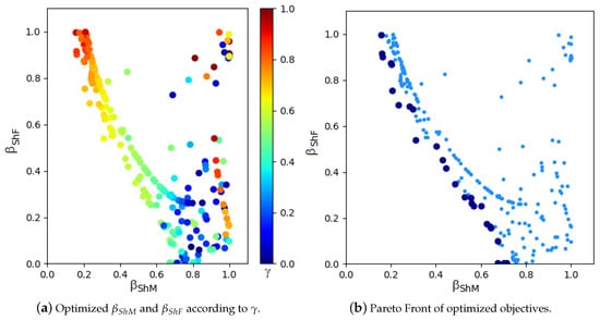- If the interest is to optimize the index related to the ShM (), without giving importance to the index related to the ShF (), the selected solution is:By using this solution, the ShM can be reduced by 79.22%, while the ShF by 1.55%.