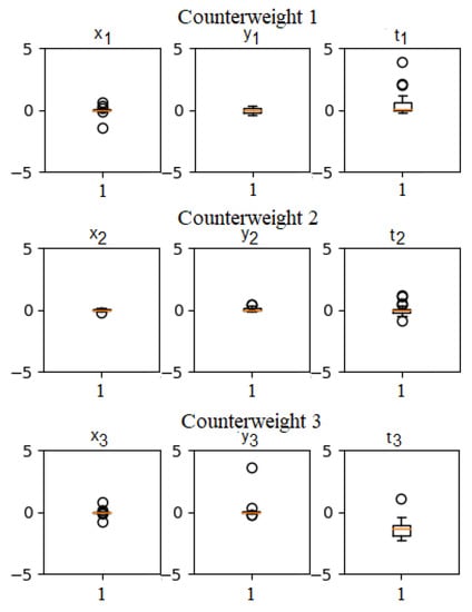 Figure A1 shows the box-plots of the partial derivatives with respect to each variable , and (for counterweights and ), when Counterweight-2 is eliminated.