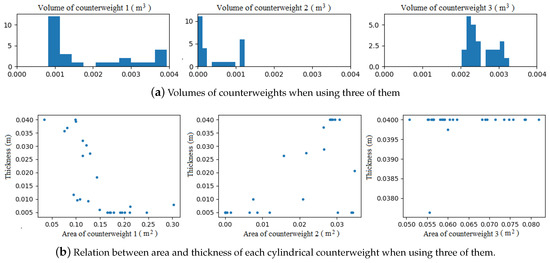 To confirm the proposed analysis, Figure A2a shows the histogram of the total volume of each counterweight. Note that Counterweight-1 is smaller than Counterweight-3, and that the relation between area and thickness of each counterweight (Figure A2b) proves that the thickness of Counterweight-3 is trying get out of the upper limit.
