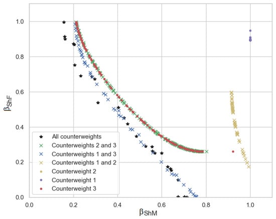Comparison between Pareto fronts proves to be an adequate methodology for the sensitivity analysis of each counterweight. This method has proved that even when using only one counterweight, the ShF can be reduced by 78.74% when giving importance to the static balancing or the ShM can be reduced by 73.61% when giving importance to dynamic balancing.