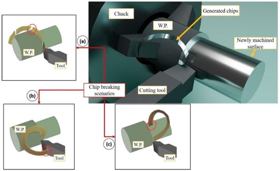 When tailoring chip breakers for machining ductile materials, it is important to consider the different breaking mechanisms of the chips generated, founded on the processed material, process parameters and cutting tool geometry. Chips are liable to break spontaneously at the weakest points along their lengths, or against the cutting tool, or against the workpiece surface [30], see Figure 1a–c. The second and third scenarios can damage the tool or surface quality, respectively. This makes it critical to control the chip evacuation process, which can be satisfactorily achieved using proper chip breaker geometry to bend the generated chip sufficiently so that it breaks on its own.