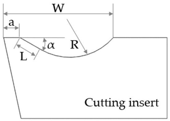 Figure 2 shows the essential parameters in the design of the cutting edge of a chip breaker: Rake angle (α); land width (a); radius of curvature (R); and tool-chip contact length (L). The groove width (W), however it is not an independent parameter, but it depends on the aforementioned ones.