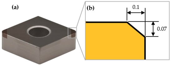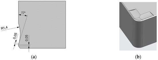 The starting geometry of the turning insert is a rhombic 80° insert CNGA 120408 with a chamfer on the cutting tool edge of 0.1 × 0.07 mm, see Figure 3a,b. Cutting conditions for this study, which belong to the cutting range data recommended by the manufacturer: Depth of cut (Ap) = 1–4 mm and feed (f) = 0.05–0.2 mm/rev, are shown in Table 1. Based on this geometry and cutting conditions, the value of the rake angle, α; land width, a; and radius of curvature, R, will be chosen systematically, considering the results of the FE simulations.