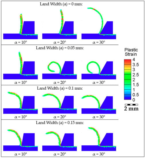 For a chip to break spontaneously (see Figure 1a), it is necessary that it curls sufficiently. For that purpose, on this first stage of the design, FE simulations trials were performed to obtain the best combination of rake angle (α) and land width (a) to optimize chip curling without using a chip breaker. These two parameters should not be analyzed independently, as the behavior of the chip during formation near the cutting edge depends on their combination.