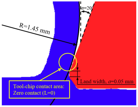 Once the optimum land width and rake angle are selected, the next step is to determine a proper curvature that enables curling the chips without getting clogged. From the previous simulation in which no chip breaker was considered, with α = 20° and a = 0.05 mm, the natural radius of curvature (R) obtained was 1.45 mm and the tool-chip contact length (L) was zero, measured from the land width (i.e., L = 0, see Figure 5). These two parameters are interrelated and, when adding the chip breaker, they will determine the tool-chip contact area.