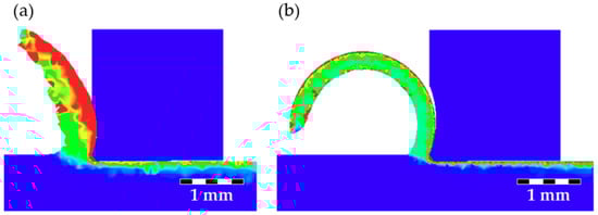 The radius (R) of the chip breaker must be selected bearing in mind the chip’s natural shape in order to increase chip curling, for the chips breaking more readily. As the natural radius of curvature without chip breaker was 1.45 mm, R of the chip breaker must be lower. There is a threshold for R that is determined as, under this value, the chips are prone to get clogged and turning efforts are triggered. Figure 6 reveals how the chip curled for two different values of R, both of them lower than the natural curvature: 1.0 and 1.4 mm. Results show that the lowest one, that is R = 1 mm, was below the threshold value, as seen in Figure 6a. As the shearing angle was reduced, the chip thickness increased, and the chip tended to be relatively straight. Therefore, this is not an admissible solution. For R = 1.4 mm, the chip curled without clogging, this being a suitable solution. Thus, to machine the material considering the cutting parameters in Table 1, a radius greater than 1.0 and equal or lower than 1.4 mm is needed.