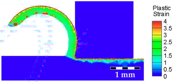 Using the final chip breaker geometry, as displayed in Figure 7, with the machining conditions shown in Table 1, a final simulation was conducted. The result, presented in Figure 8, shows an acceptable chip curling, with a radius of curvature corresponding to R = 1.4 mm, without clogging.