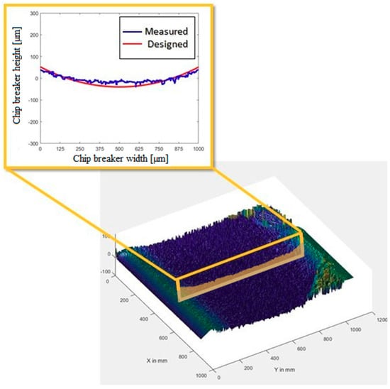 The chip breaker geometry was produced by ablating sequential layers, but it is well known that the resultant surface roughness is higher when layers are thicker. Thus, in order to minimize surface roughness, the thickness of the layers was chosen to be less than 4.0 µm. The results of the preliminary experiments showed that when ablating parallel trenches under 0.8 m/s scanning speed and 10 µm of overlap distance between parallel trenches, the ablated-layer thickness was among 3.6–4.0 µm. As a result, the concluding chip breaker contour was divided into 20 layers and fed into the laser software to be ablated sequentially using the identified optimum parameters. Figure 9 illustrates the geometry of the chip breaker after the laser manufacturing process. The ablated geometry of the chip breaker was measured, as seen in Figure 10, using a confocal 3D optical profiler, S NEOX by SENSOFAR Metrology, Terrassa, Barcelona, Spain. The results revealed a good agreement (with 6% error) between the measured and designed width of the chip breaker. However, a higher discrepancy of 14% was detected for the produced depth of the ablated chip breaker when compared with the designated geometry.