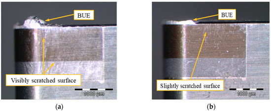 Figure 14a,b show how the BUE was much pronounced in the tool without chip breaker when compared with the insert with chip breaker. Besides, the scratches can be seen in the insert as well. While the insert without chip breaker showed noticeable scratches, the one with chip breaker showed only minor scratches.