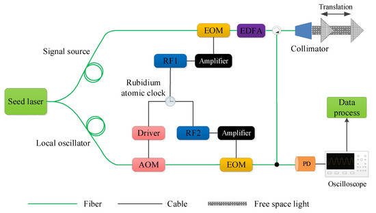 Figure 1 shows the experimental system. The output of the seed laser (RIO ORION Laser Module, 1543.5 nm, 5.1 kHz line width, 18 mW) is spilt into two parts. One part is modulated by an electro-optic phase modulator (EOM, EOSpace, <5 V half-wave voltage Vπ, 2 W RF power) with 10 GHz repetition frequency, which works as the seed of the signal source. The output of the EOM is amplified to 500 mW by an Er-doped fiber amplifier. After the optical circular, the beam size of the signal source is expanded to 20 mm by a large collimator (micro laser system, FC40), which can guarantee that the received reflected light is strong enough. Then, the laser is incident on a moving corner prism, which is mounted on an electrical rail (Zolix, LMA-TR-200, travel 200 mm, resolution 1 μm/s) whose velocity can be precisely controlled. The other part serves as the seed of the local oscillator. An acousto-optic modulator (AOM; AA opto-electronic MT110, 110 MHz frequency shift) is used to avoid the frequency ambiguity. Then, the output of the AOM is modulated by another EOM (EOSpace, <5 V Vπ, 2W RF power) with 10.001 GHz repetition frequency. The RF driver1 (Agilent N5173B) and RF driver2 (Agilent E8267D) are locked to a rubidium atomic clock (Microsemi 8040, 2×10−11 stability with 1 s averaging time). Finally, the two parts are combined by a beam splitter and detected by a fast photodetector (Menlosystems FD310). The stored waveforms by an oscilloscope (LeCroy Waverunner 610Zi) can be processed to obtain the Doppler shift information.