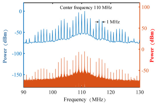 Before moving the target, beat notes between the signal source and the local oscillator were measured by a spectrum analyzer (ROHDE&SCHWARZ FSH8, 3 kHz RBW). Then, the waveform obtained by the oscilloscope was Fourier transformed to obtain the new comb due to beat. As shown in Figure 2, we can see that the Fourier transform can basically reproduce the beat frequency spectrum. Additionally, the center frequency of the beat notes is 110 MHz, which is the driving frequency of the AOM. The frequency interval of the comb teeth is 1 MHz, which is the frequency difference between the driving frequencies of the two RF drivers. Actually, the frequency of RF driver1 is 10 GHz and the frequency of RF driver2 is 10.001 GHz. This means that frep.sig = 10 GHz and frep.loc = 10.001 GHz.