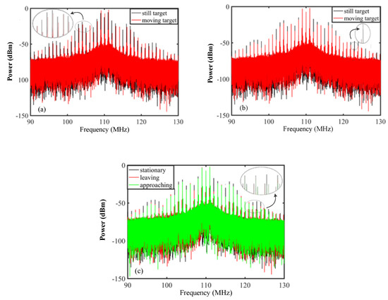 To show the feasibility of the electro-optic dual-comb Doppler velocimeter, Figure 3 shows the difference between Fourier transforming the waveforms when the target is stationary and when it is moving. In Figure 3a, the black comb expresses the measured spectrum when the target is stationary and the red comb is that when the target is moving away from the collimator. It can be seen that every comb has a reduced offset due to the Doppler effect. As the target’s velocity is much lower than that of light, the Doppler shift generated at 10 GHz repetition frequency is too small to be seen in the spectrum. In order to show that the repetition frequency has changed, we translate the red comb and move its center frequency to 110 MHz in Figure 3b. Hence, the changes of frequency interval can be seen on the high-order comb teeth due to the cumulative effect. It is thus proved that the Doppler effect causes a change in the repetition frequency, which can be used to calculate the velocity of a moving target. To show the directional discriminability, Figure 3c shows the frequency spectrum when the target is stationary, as well as leaving from and approaching the collimator with v = −100 mm/s and v = +100 mm/s. As can be seen, for the same teeth of the combs, the green line is on the left and red line is on the right. This proves that approaching leads to an increase in the repetition frequency and leaving leads to a reduction in the repetition frequency.