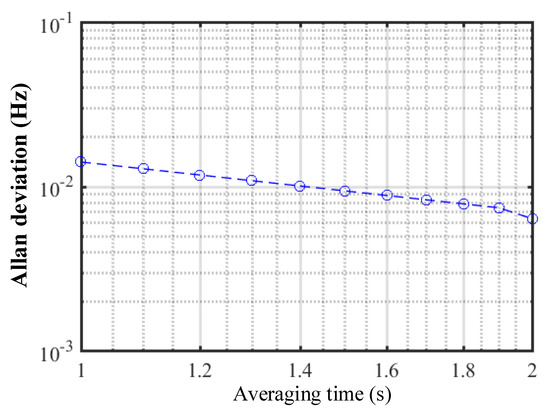 Theoretically, the upper limit of the speed measurement is limited by the difference between the two optical comb repetition frequencies. In this experiment, a difference of 1 MHz limited the maximum speed of the measurement at 15 km/s. Additionally, the resolution was limited by the frequency stability and FFT resolution. Figure 5 shows the Allan deviation of a 1 MHz frequency, which is mixed with the output of the two RF drivers at 110 MHz and 111 MHz. The Allan deviation is well below 14 mHz, with the averaging time larger than 1 s, which corresponds to a resolution of 0.21 mm/s. In our data processing, the FFT resolution was 5 Hz, which corresponds to a resolution of 75 mm/s. Since we selected 16 teeth to calculate the change of repetition frequency, the resolution could be improved to 4.69 mm/s.