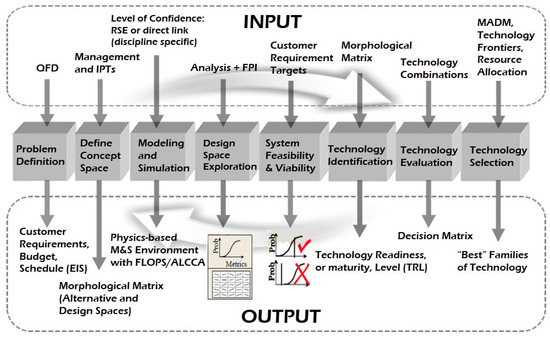 Procedure and composition of the technology identification, evaluation, and selection (TIES) method. RSE, Response Surface Evaluation; QFD, Quality Function Deployment; IPT, Integrated Product Team; FPI, Fuzzy Performance Index; MADM, Multi Attribute Decision Making; EIS, Enterprise Investment Scheme; FLOPS, Flight Optimization System Program; ALCCA, Aircraft Life Cycle Cost Analysis.