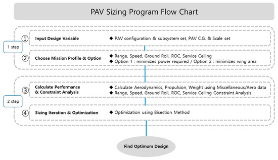 As shown in Figure 2, the PAV sizing tool requires the following steps: (i) specify the design variables, (ii) choose the mission profile and option, (iii) calculate the performance and perform a constraint analysis, and (iv) iterate the sizing process and perform optimization. The baseline configuration of the PAV is shown in Figure 3 and Figure 4.