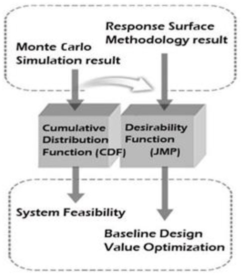 In order to determine the feasibility and viability of the system, the MCS results were fed into the CDF and the feasibility of the system was assessed through a comparison with the target values. The desirability function was then used for the results of the RSM. A schematic of the feasibility and viability of the system is presented in Figure 6.