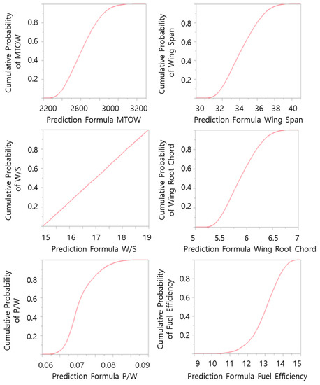 In order to capture the effects of all of the design variables at once, the DOE had to be used along with not only a regression analysis but also a Pareto plot with a p-value. The vertical axis is the frequency of occurrence, but it can alternatively represent the important unit of design variables. Because the values are in decreasing order, the cumulative function is a concave function. To take the example in Figure 5, in order to design the maximum takeoff weight (MTOW) by 80% target value, it is sufficient to consider the first five design variables, i.e., takeoff ground roll, passengers, cruising speed, maximum speed, range. The purpose of the Pareto chart is to highlight the most important among a (typically large) set of factors. In quality control, it often represents the most common sources of defects, the highest occurring type of defect, or the most frequent reasons for customer complaints, and so on. In this study, based on the Pareto plot and cumulative density distribution, the authors explored the design variables that could take into account the variability of a target value at 80% through a screening test.
