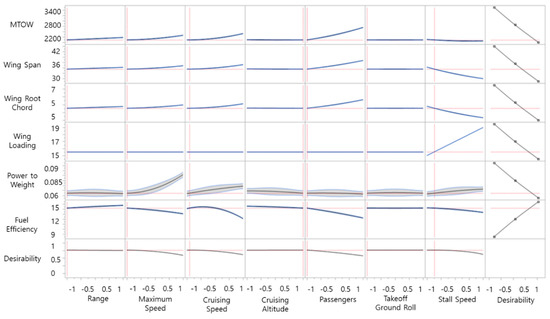 In Figure 8, the x- and y-axes represent the design variables and responses, respectively. In addition, the characteristic of desirability is depicted in Figure 8. The optimized design variables and target values are summarized in Table 8 and Table 9, respectively. It should be noted that the optimized target values were evaluated by the PAV sizing tool, which means that the values were not estimated by the RSE. As depicted in Table 9, it was found that all design variables except for the wing root chord reach the target values. The wing root chord design variable was investigated further in the technology identification section below.