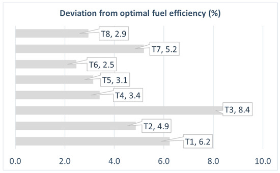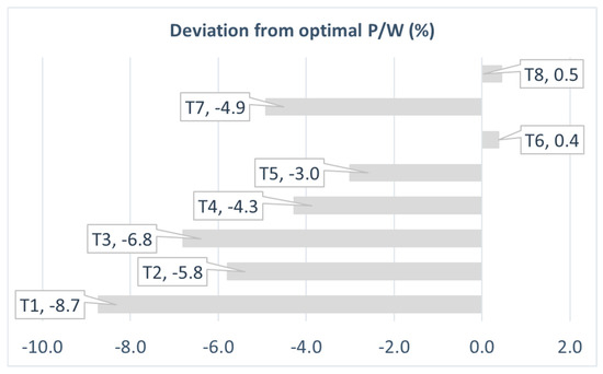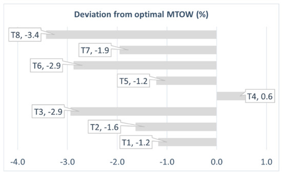In order to conduct a technology sensitivity analysis, each technology infuses the optimized design variables to determine how the design variables change. In general, a technology sensitivity analysis enables one to observe how a target value varies when the technology is infused in the design space. In this study, technology sensitivity analyses were performed with the eight selected technologies. The deviations for each of the target responses are depicted in Figure 9, Figure 10, Figure 11, Figure 12 and Figure 13. As a result, the following observations were made. (i) The advanced composite material (T8) technology has the greatest impact on the MTOW and reduces it by 3.4%. (ii) The flow circulation flap (T1) and advanced ducted fan (T5) technologies have the lowest impacts on the MTOW, reducing it by 1.2%. (iii) The piezoelectric active skin (T4) technology increases the MTOW by 0.6%. Both the wing span and wing root chord show identical trends with regard to the MTOW. (iv) The flow circulation flap (T1) technology has the greatest impact on the P/W ratio, reducing it by 8.7%. (v) The advanced ducted fan (T5) technology has the lowest impact on the P/W, reducing it by 3%. (vi) The liquid metal (T6) and advanced composite material (T8) technologies increase the P/W by 0.4% and 0.5%, respectively. (vii) Regarding the fuel efficiency, all technologies increase the fuel efficiency. For instance, the nanocoating (T3) technology increases the fuel efficiency by 8.4%.