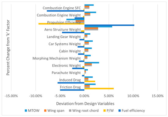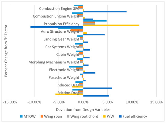 The k factors are fed into the PAV sizing tool calculation, in this case with the calculated weight and drag force as weighted parameters. Additionally, a k factor sensitivity analysis enables us to analyze how each k factor affects the design space. Accordingly, the k-factor sensitivity analysis can help decision makers during the PAV design process find the proper technologies that contain the best combinations of technologies. In this study, a k-factor sensitivity analysis was conducted with 19 factors that could have an impact on the optimized design results. The lower and upper bounds for the k factors were correspondingly defined with negative and positive 10% intervals. As a result, 12 factors were finally chosen after considering the sensitivity results. The selected factors are as follows: the combustion engine Specific Fuel Consumption (SFC), combustion engine weight, propulsion efficiency, structure weight, landing gear weight, car system weight, cabin weight, morphing mechanism weight, electronic weight, parachute weight, induced drag, and friction drag. Based on the observations from the k-factor sensitivity analysis, here are the findings. (i) As the “combustion engine SFC” factor increases, the MTOW/wing span/wing root chord value increases while the power-to-weight ratio/fuel efficiency decreases. (ii) As the “combustion engine weight” factor increases, the MTOW/wing span/wing root chord value increases while the power-to-weight ratio/fuel efficiency decreases. (iii) As the “propulsion efficiency” factor increases, the MTOW/wing span/wing root chord/power-to-weight ratio decreases while the fuel efficiency increases. (iv) As the “structure weight” factor increases, the MTOW/wing span/wing root chord value increases while the power-to-weight ratio/fuel efficiency decreases. As can be seen, the factors related to the weight (i.e., the “combustion engine weight” and the “structure weight”) have identical tendencies as the k factors are varied. (v) As the “induced drag” and “friction drag” increase, the MTOW/wing span/wing root chord/power-to-weight ratio increases while the fuel efficiency decreases. All of these results are shown in Figure 14 and Figure 15.