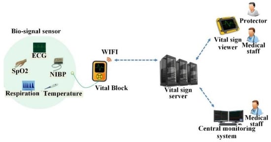 Recent technological advances in sensors, low-power integrated circuits, and wireless communications have accelerated the tremendous growth of medical wearable devices. This advance originates from the need to monitor a patient over an extensive period of time. Especially, Internet of Medical Things (IoMT)-based wearable devices can monitor long-term physiological signals and upload data to the cloud via a wireless communication system [8]. Figure 2 shows the concept of a wireless patient monitoring system. The system consistently monitors the bio-signals of patients and sends the measured bio-signals to the wearable smart device or central monitoring system [9,10]. For cardiac patients, wearable heart monitoring sensors have already become a life-saving intervention ensuring continuous monitoring during daily life. Patients can be equipped with wireless, miniature and lightweight sensors [11]. The sensors store the bio-signals in real-time and then periodically upload the data to a DB server [11]. The recorded bio-signals may be analyzed in the wearable device itself to predict a warning level. If the early analyzed result is above a threshold, a warning alarm is sent to the medical staff of the hospital [12]. In order to acquire accurate response with less computational complexity as well as a light weight and long battery time, the development of a fast and accurate algorithm for wearable heart monitoring sensors is needed. For a remote ECG monitoring application, R or QRS detection is a preliminary step for detecting the heartbeat for the subsequent rhythm classification. A computationally efficient R or QRS detection algorithm is indispensable for the low-power operation of a wearable ECG device. The QRS detection algorithms developed to date can be categorized as derivative [13], digital filters [14,15,16], Wavelet transform [17,18], Hilbert transform [19,20], phasor transform [21], adaptive threshold [22,23], morphology [24,25], and signal energy [14,26,27,28] based algorithms. The mentioned methods show superb QRS detection performance; however, major issues under the mobile environment include the low-complexity algorithms and real-time processing methods related to power efficiency and processing speed.