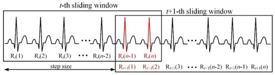 Figure 3 shows a connection example of R peaks detected per successive sliding window for real-time processing. In the figure, denotes the n-th detected R-peak in the t-th sliding window. In the proposed method, the R peak is detected in the sliding window unit for real-time processing. Thereafter, overlapping R peaks ( and in the figure) are detected between the sliding windows to merge the detected R peaks for each sliding window, and the detected R peaks in the front (t-th) and rear (t+1-th) sliding windows are connected using the detected overlapping R peaks. The setting for the sliding window is set considering bradycardia. To get a successive R peak sequence even for bradycardia (less than 60 heartbeats per minute), the length of the sliding window and overlapped interval between sliding windows should be at least 3 s and 1 s, respectively. In the proposed method, the size of sliding window is set to 2000 samples (about 5.6 s) based on MIT-BIH DB (360 samples/s), and the step size of sliding window is set to 1600 samples. This means the overlapped interval between sliding windows is 400 samples (about 1.1 s). Thus, the length of the sliding window and overlapped interval can be adjusted according to the sampling rate of the measured ECG signal.