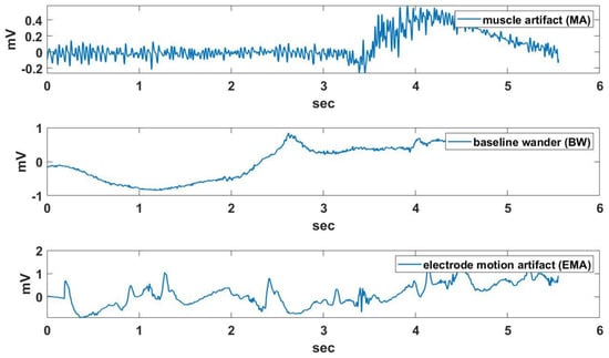 The measured ECG signal is corrupted by various noises, which makes exact R detection difficult. The noise of the ECG signal is classified as muscle artifact (MA), baseline wander (BW), and electrode motion artifact (EMA), as shown in Figure 4. The ECG noises are extracted from the MIT-BIH Noise Stress Test DB (NSTDB) [33]. MAs occur when skeletal muscles contract, the patient moves or because of shivering due to the inappropriate temperature of the environment [34]. The main problem with these interferences is the spectral overlap between the ECG and the muscle noise. BW is a type of low-frequency noise which adds to the ECG signal, resulting in a varying baseline. This noise is caused by changes in the impedance between the electrode and the patient’s skin. These changes might be caused by movement, breathing or by perspiration, leading to a change of distance between the source of the signal, the heart, and the electrodes [35]. EMA is generally considered the most troublesome problem, as it can mimic the appearance of ectopic beats and cannot be removed easily by simple filters, as with noise of other types [33]. ECG signals measured in a measurement room or with a stable posture are relatively clean, but ECG signals measured under motion may contain various noises.