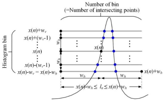 where . The total number of bins in the histogram for is always the same, but the range of bin values depends on the signal height of . Also, the histogram represents the number of bin (signal height) for the ECG signal in the ROI, and the histogram value becomes large in the local region where the frequency is high, such as MA.
