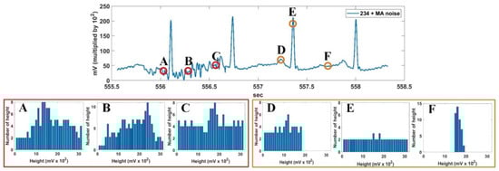 The characteristics of the vertical histogram in the noise region (A, B, and C) and ECG signal region (D, E, and F) is shown in Figure 6. In the figure, the noisy signal was created by adding MA to the Record 234 signal of MIT-BIH DB. The noise region generally has a higher vertical histogram value per bin, whereas a typical ECG signal region has a different vertical histogram distribution depending on the location of the signal point being processed. For the ECG signal, the vertical histogram at the peak point of the important P, R, and T waves (D in the figure; i.e., the peak of the P wave) is concentrated in the low bin section. The rising or falling interval of the important wave (E in the figure) has a flat histogram distribution over the entire bin range, while the flat interval (F in the figure) has a histogram distribution densified in a specific bin. As a result, we can see that the sum of the vertical histograms in the noise region is larger than the normal ECG signal region. Thus, a vertical histogram sum at each signal point is used to distinguish the noise point from the normal signal point.