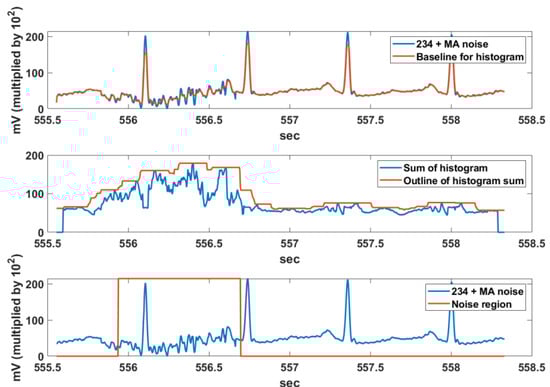 The proposed method is basically robust to BW because it uses the product of two kinds of derivative filters. In addition, the processing of the sliding window unit can minimize the influence of false detection by strong noise. The proposed noise detection method is designed to cope with BW and EMA. The vertical histogram for the region of interest (ROI) around the signal point to detect MA and EMA is shown in Figure 5.