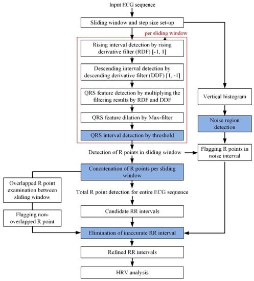 Entire block-diagram of proposed real-time R and QRS detection method. HRV: heart rate variability.