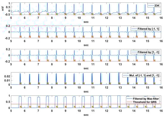 where means half of the filter size of the maximum filter. As shown in Figure 10, by applying the threshold to the normalized max filter result , the candidate QRS interval is obtained as follows: