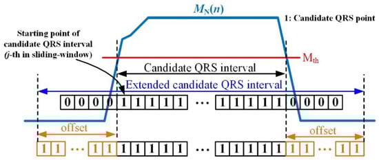 where is a threshold value for determining whether the current signal point belongs to the candidate QRS point. If the number of consecutive candidate QRS points (successive columns of “1” in the figure) exceeds a certain threshold, the interval is classified as a candidate QRS interval including R. The extended candidate QRS interval to improve the reliability of the R detection rate is obtained by adding an additional interval ( in Figure 10) to both sides of the candidate QRS interval.