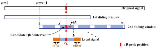 where is the point position in the sliding window, and subscripts and denote the sliding window and the local signal interval corresponding to the candidate QRS, respectively. In addition, the R peak position in the original signal is calculated by step size as follows:
