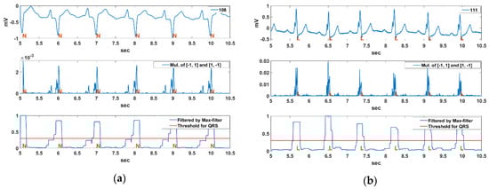 Figure 12 shows the QRS detection result using a pair of derivative filters and the max filter for the Record 108, 111, 118, 217, and 214 sections in MIT-BIH DB. The annotations, N, L, R, /, and V, as mentioned in the introduction, represent NSR, LBBB, RBBB, Paced, and PVC rhythms, respectively. The MIT-BIH ECG signals used in the experiments were filtered by a low-pass filter with a 40 Hz cut-off frequency. The Record 108 section is an exceptional NSR rhythm, which contains bigger P waves and inverse QRS complexes. The Record 111 section are LBBB rhythms including notched QRS complexes and bigger T waves, and the Record 118 section are RBBB rhythms including deformed P waves and inverted T waves. The Record 217 section is a paced rhythm that includes deep S waves and bigger T waves, and the Record 214 section is a complex rhythm with both LBBB and PVC beats. We can see that the bigger P and T waves are suppressed while the QRS complex is enhanced from the multiplication result of the derivative filter pair. The QRS complex can also be detected by using a constant threshold () for the normalized maximum filter result for the multiplication of the pair of derivative filters.