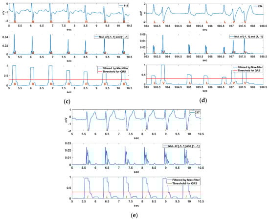 QRS detection result using a pair of derivative filters and a max filter for Record (a) 108, (b) 111, (c) 118, (d) 217, (e) 214 sections in MIT-BIH DB.