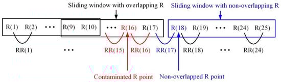The reliability of the detected R points is considered in two aspects; i.e., (1) whether detected R exists in the noise region, or (2) whether the first R in the current sliding window overlaps with the R in the previous sliding window. Figure 13 shows an example for the exclusion of unreliable RR intervals. In the figure, represents the position of the n-th detected R point in the entire ECG signal. If R (16) is an unreliable R point detected in the noise region, RR (15) and RR (16) thus calculated are also unreliable and should be excluded from the ECG analysis. Also, if R (18) is the first detected R point in the current sliding window and does not overlap with the R points in the previous sliding window, the detected R points between the sliding windows lack continuity. As a result, RR (17) calculated by R (18) is unreliable and excluded from the ECG analysis. However, R (18) and R (19) are guaranteed to have continuity, so RR (18) is a reliable RR interval. This relationship is expressed as follows: