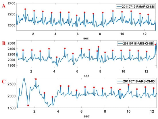 The CYBHi DB (1000 samples/s) [31,32]—which comprises off-the-person data—is also used to verify the R point detection performance of the proposed method. The signals of the DB contain more noise compared to the MIT-BIH DB. The sliding window length of 3000 samples and the step size of 1500 samples are used for the experiment. The ECG signals of the CYBHi DB used in the experiments were filtered by a low-pass filter with a 40 Hz cut-off frequency. Figure 15 shows the R point detection result for the Record 20110719-RMAF-CI-8B, 20110718-ARS-CI-8B, and 20110718-ARS-CI-85 sections in the CYBHi DB. While the 20110719-RMAF-CI-8B section contains bigger T waves, the 20110718-ARS-CI-8B section and 20110718-ARS-CI-85 section contain DC wandering and bigger P waves. Nevertheless, it can be seen that the proposed method detects the R point relatively accurately.