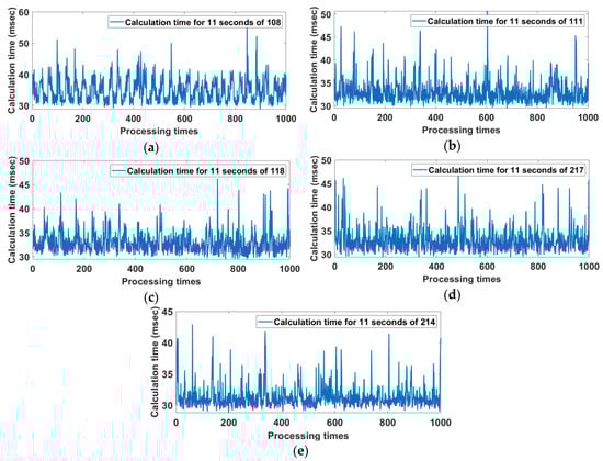 Calculation time per 1000 iterations for 11 seconds of Record (a) 108, (b) 111, (c) 118, (d) 217, and (e) 214.