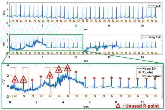 This section attempts to analyze the reliability of the proposed method for noisy signals. For the experiment, a relatively stable Record 234 with a constant RR interval was contaminated at 5 s intervals by the MA and BW of the NSTDB [33], as shown in Figure 17. The third-row figure shows the R points and noise regions detected in the noisy Record 234 signal. The noise regions were detected by the noise detection method using the vertical histogram introduced in Section 2.2. In the noise region, the low signal level represents non-noise regions, while the high signal level means noise regions. Also, the R-points indicated by the triangle are the R-points contaminated by noises and are excluded from the RR interval analysis because the contaminated R-point degrades the accuracy of the RR interval analysis.