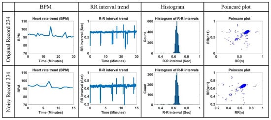 The analysis similarity for the original Record 234 and the noisy Record 234 is shown in Figure 18. In the case of the noisy Record 234, half of the total signal was contaminated by noise. As a result, the contaminated R points were excluded from the analysis of the figure, and the overall detection time was reduced by half. The average beat-per-minute (BPM), average RR interval, root mean square of successive differences (RMSSD) and width and length in a Poincaré plot are 92.44 bpm, 0.65 s, 0.04 s, 0.02, and 0.05 for the original Record 234 and 92.62 bpm, 0.65 s, 0.04 s, 0.03, and 0.05 for the noisy Record 234, respectively. We can see that the analysis result of the noisy Record 234 is similar to that of the original Record 234, even though it was undermined by MA and BW.