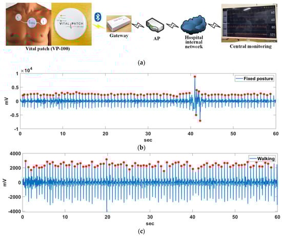 Actual ECG data were measured by a developed wearable ECG patch with a 250 Hz sampling rate, as shown in Figure 19a, where the ECG patch was developed by TriBell-Lab and ETRI (Electronics and Telecommunications Research Institute) in South Korea. The ECG signals measured by the ECG patch are stored in the hospital DB via Bluetooth, Gateway (Bluetooth to WiFi), AP, and the hospital internal network, and are analyzed in real-time using the proposed algorithm. Ten minutes of ECG data at a fixed posture and walking for a 36-year-old man without heart disease were measured. Figure 19b,c show the 1 min length for two situations. Also, the R points on the measured ECG signals were detected by the proposed method.