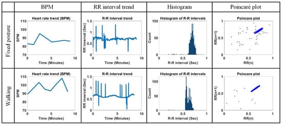 Comparison of BPM, RR interval trend, histogram of RR interval, and Poincaré plot for measured ECG signal in fixed posture and walking.