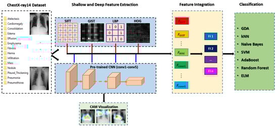 In this section, we present our proposed framework of multiple feature integration for the ChestX-ray14 classification. The overall approach, illustrated in Figure 1, mainly consists of (1) feature extraction using both shallow handcraft descriptors and pretrained deep CNN, and localization of pathological regions via CAM; (2) appropriate feature integration with massive and expensive experiments; and (3) classification of 14 thoracic diseases using different classifiers.