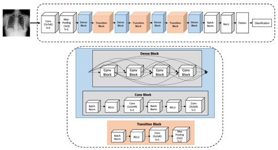 To generate the CAM [50] of the 14 pathological regions and extract deep features, we use the pretrained DenseNet-121 [44], which was trained for pneumonia detection from our targeted ChestX-ray14 dataset. The model architecture of the DenseNet-121 is shown in Figure 2. Compared to the other pretrained CNNs, DenseNet-121 can improve the intake of information and gradients through the network, in which a layer obtains a collective knowledge from all previous layers; passes on its own feature maps to subsequent layers; and then concatenates them into the depth dimension. Thus, the network can be thinner and compact due to having fewer layers. The training error is able to be easily propagated to the previous layers more directly and more computational efficiency tends to be drawn. The network can also learn more diversified and richer feature patterns as the classifier in DenseNet uses features from all complexity levels giving more smooth decision boundaries when training data is insufficient.