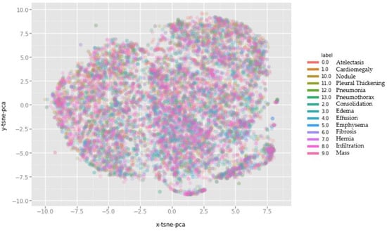 To verify the efficacy of our proposed approach, we conduct experiments on the publicly available ChestX-ray14 dataset recently introduced in [4]. With a total of 112,120 X-ray images acquired from 30,805 unique patients with 14 disease labels, it is the largest collection of front-view chest radiographs to date. Each image is marked by a single or multiple labels based on the radiology reports, with 90% accuracy. Furthermore, 984 labeled bounding boxes (B-Box) are provided by board-certified radiologists. Thus, we select these 984 images as “annotated” for testing CAM visualization and the remaining 111,240 “unannotated” images for training the DenseNet-121 model. We show the complex and diverse distribution of 10,000 sampled images by plotting t-distributed stochastic neighboring entities (t-SNE) [59] and conducting a principle component analysis (PCA) [60] (Figure 3).